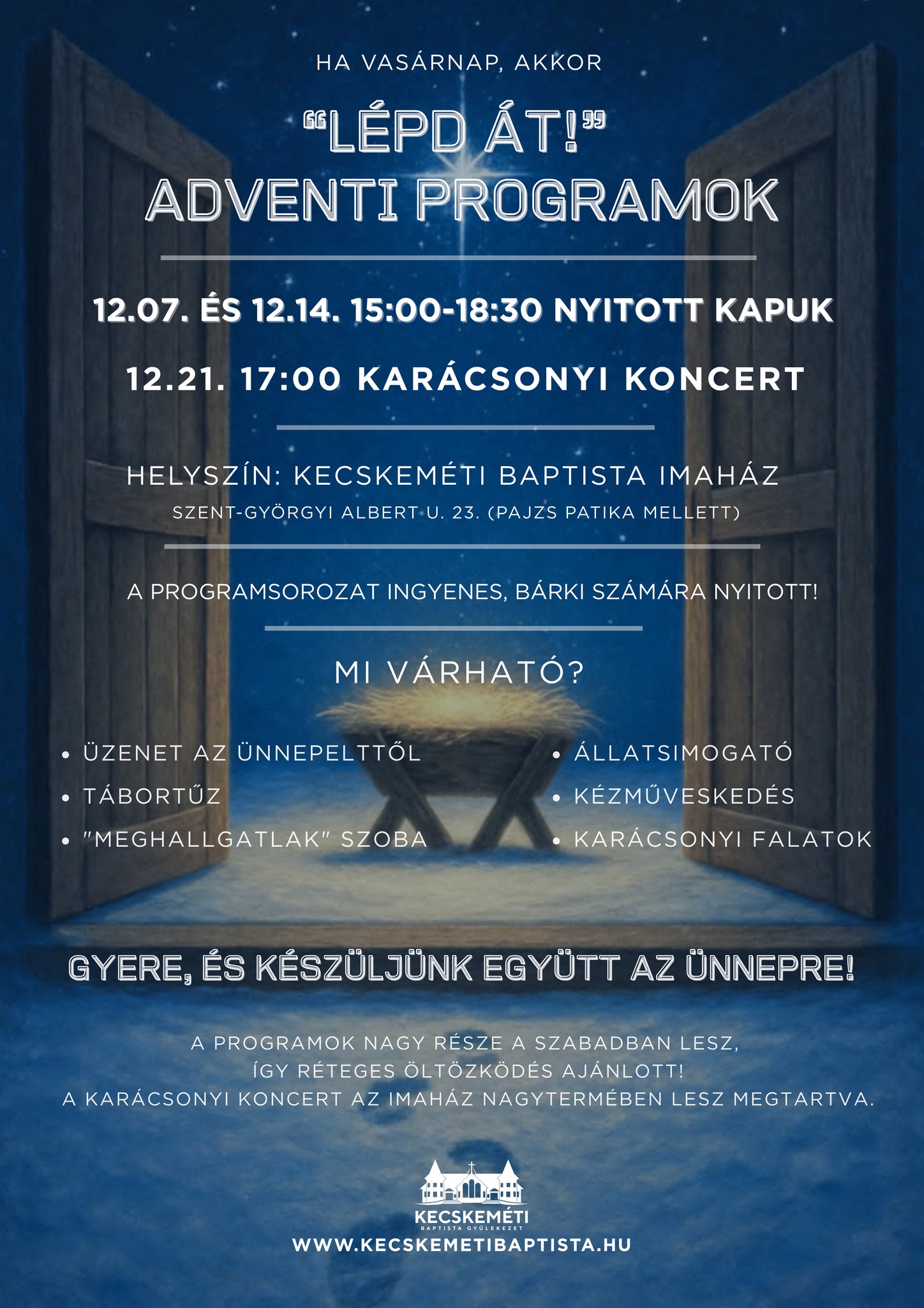 December 7-én és 14-én 15:00–18:30 között nyitott kapukkal várunk mindenkit, ahol családi és közösségi programokkal készülünk az imaház udvarán és alagsorában.